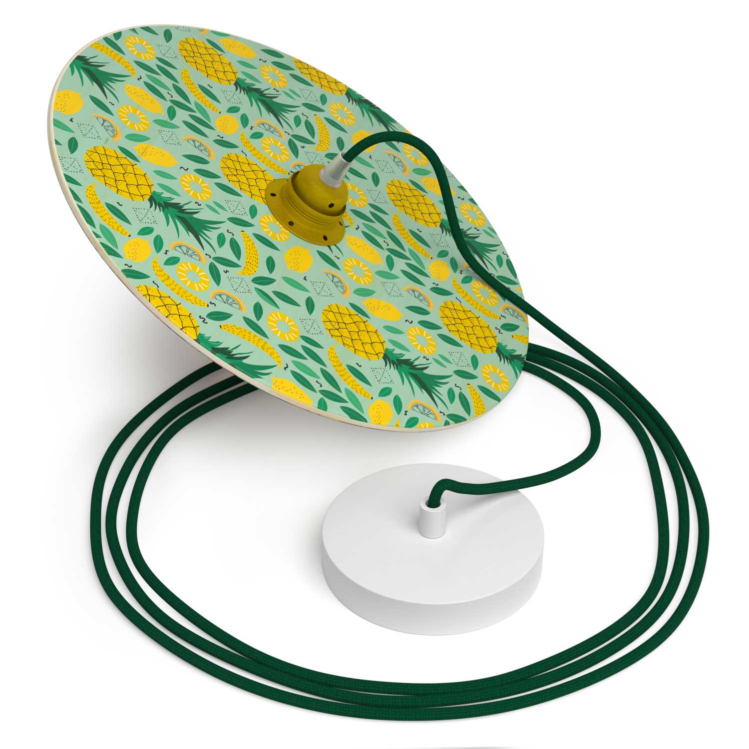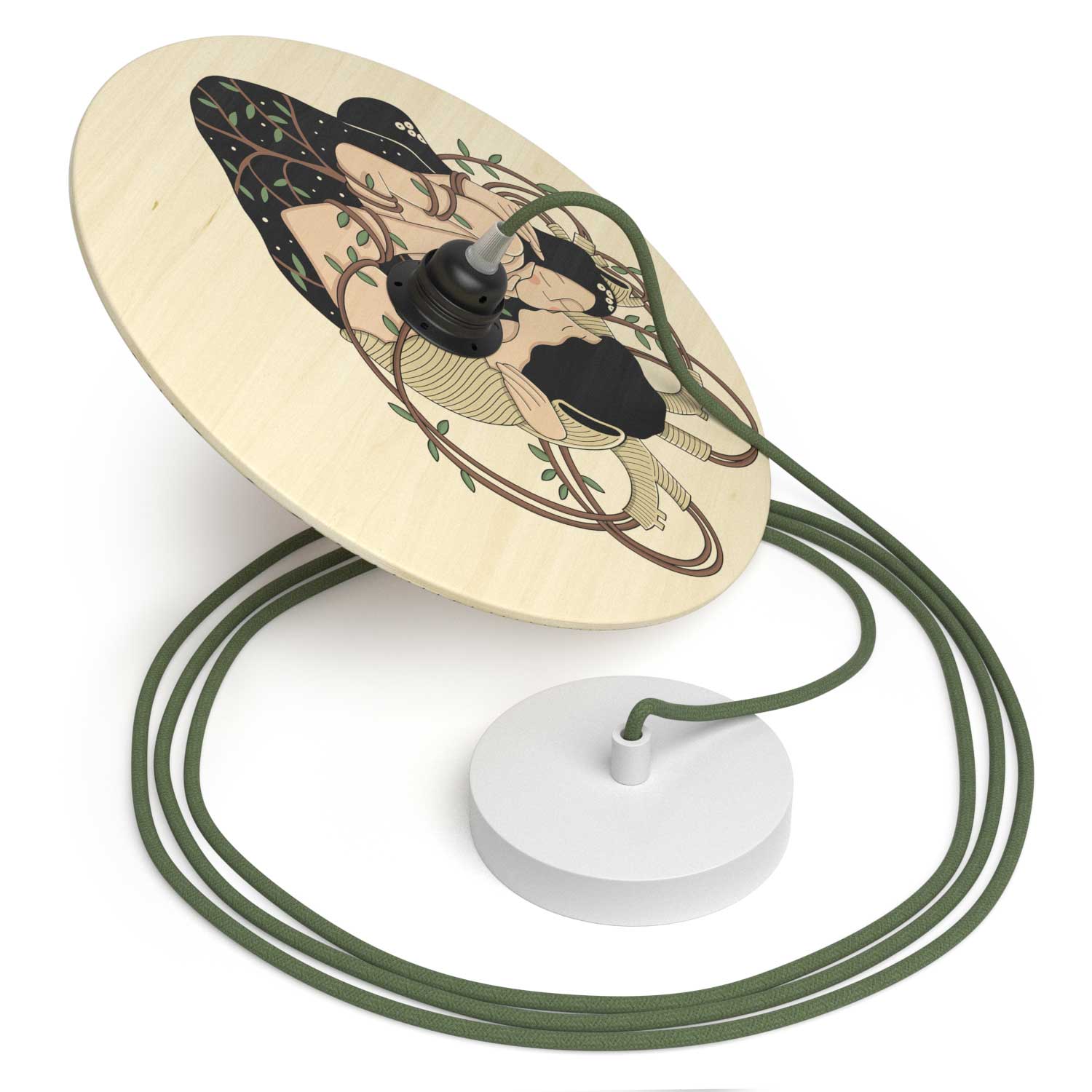 Viseća lampa s kompletnim tekstilnim kabelom, sjenilom od drveta UFO double-face i metalnim završecima - Annachiara Zaminato