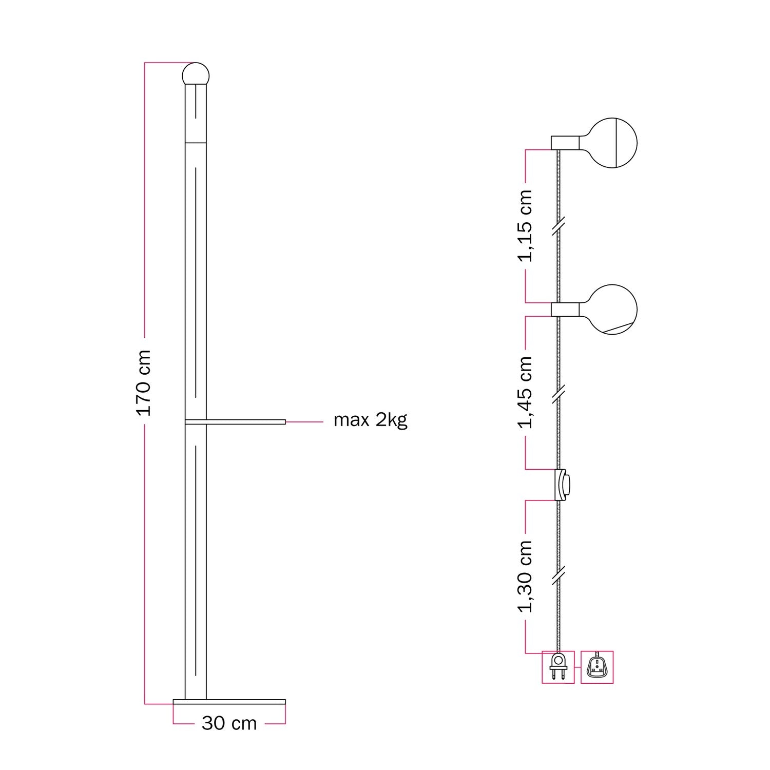 Završetak je obilježen kuglom na koju se naslanja magnetska lampa, koja se može slobodno okretati kako bi usmjerila svjetlo tamo gdje je potrebno. Utor koji se proteže duž cijele strukture omogućuje smještaj Kabela, pretvarajući ga u uredan estetski element, osim što je funkcionalan.